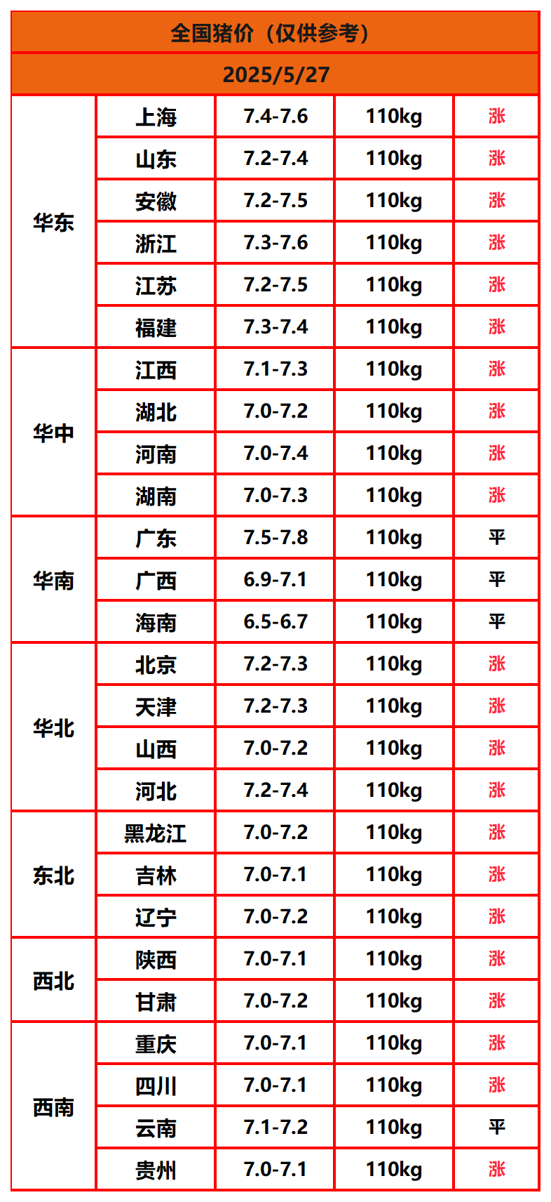 2025年5月27日猪价,今日全国猪价行情走势:22涨4平0跌。